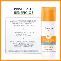 Eucerin Sun Face Oil Control FPS 50+ Tono Medio protege la piel grasa y con tendencia al acné de los daños inducidos por el sol con la Tecnología Espectral Avanzada y la defensa contra la luz HEVIS para una proteccin UV muy alta, ofreciendo un control de la grasa y el brillo durante 12 horas, además de pigmentos de color para un tono de piel uniforme y unificado.
