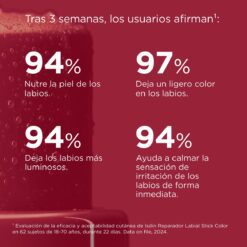Stick labial con color y ácido hialurónico que aporta hasta 24 horas de hidratación intensa.