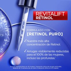 Formulado con Retinol Puro. Este activo antiedad por excelencia, posee la capacidad de, en solo dos semanas, reducir las arrugas más profundas, mejorar la textura de la piel, unificar el tono, y devolverle la elasticidad y luminosidad a la piel. Al probarse, los resultados fueron una reducción de arrugas para el 100% de las mujeres que utilizaron el producto. Exclusivo para uso nocturno. Validado por Dermatólogos.