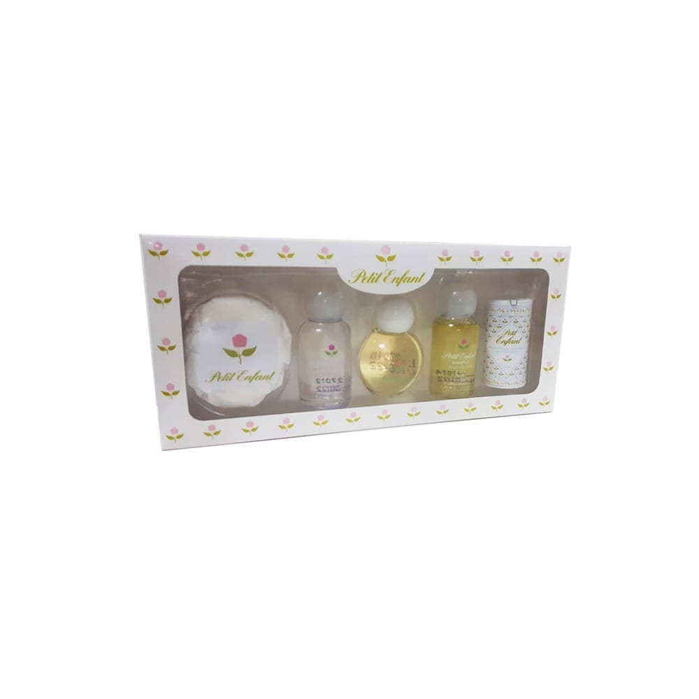 Contiene jabón 60 gr, Polvo fécula 10gr, Colonia 30ml, Shampoo 35ml.